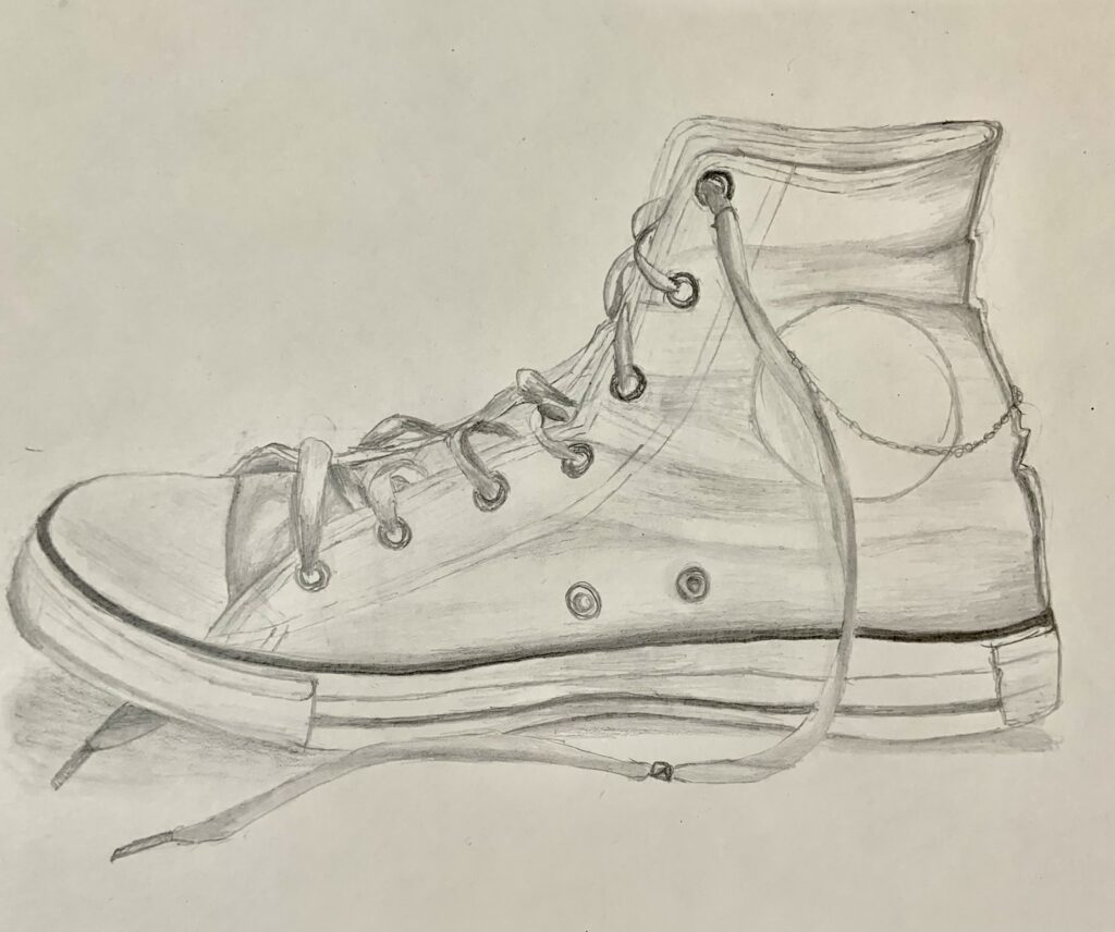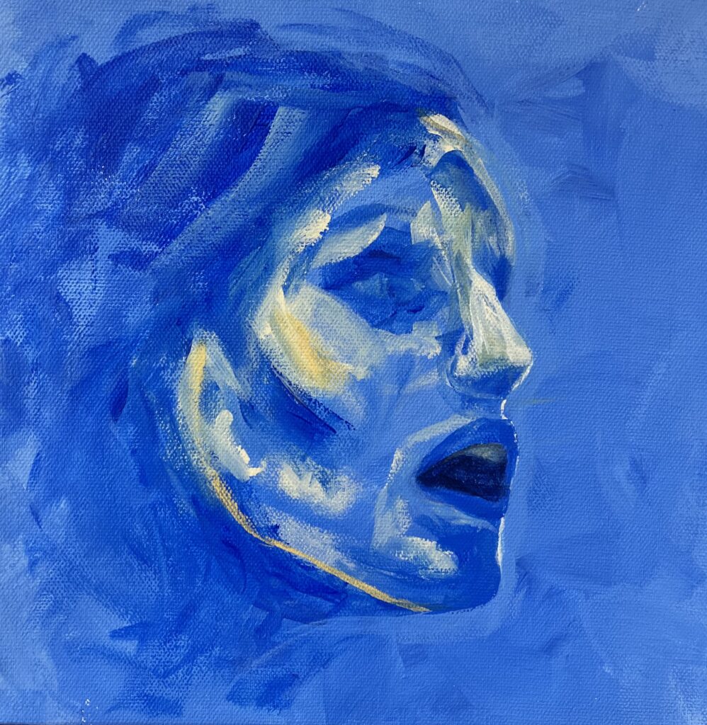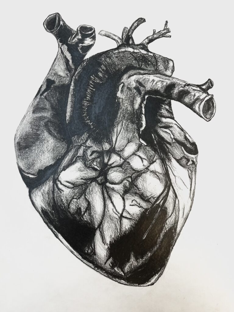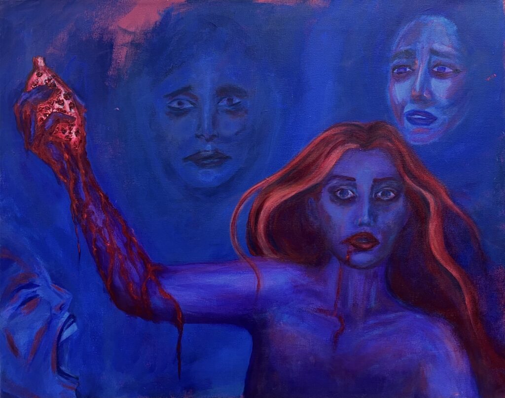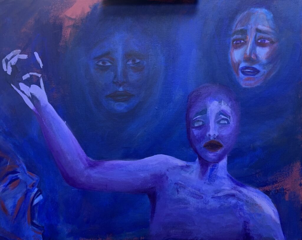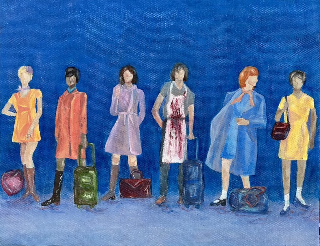 Once when at the airport, my family saw a man with a bloody apron, seemingly unnoticed. For her birthday, my mom requested a piece inspired by that experience. By using a vague background, no faces, and an unclear era, I was able to create a feeling of anonymity and strangeness.