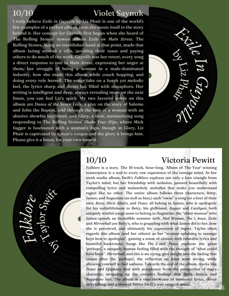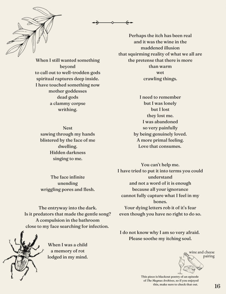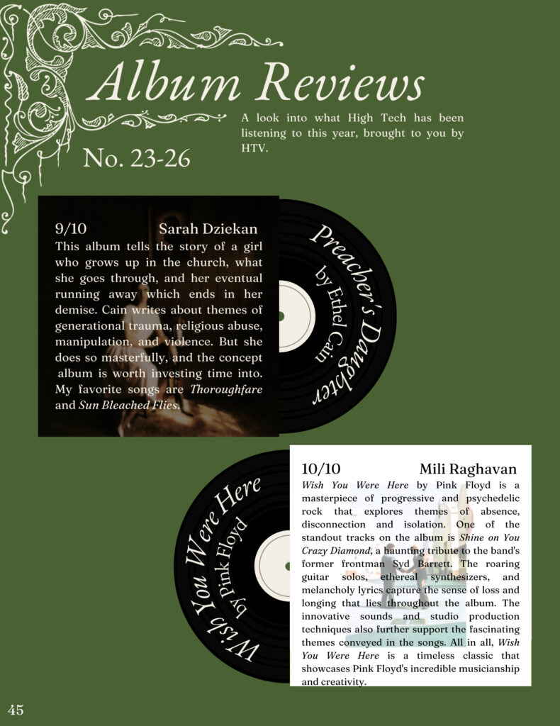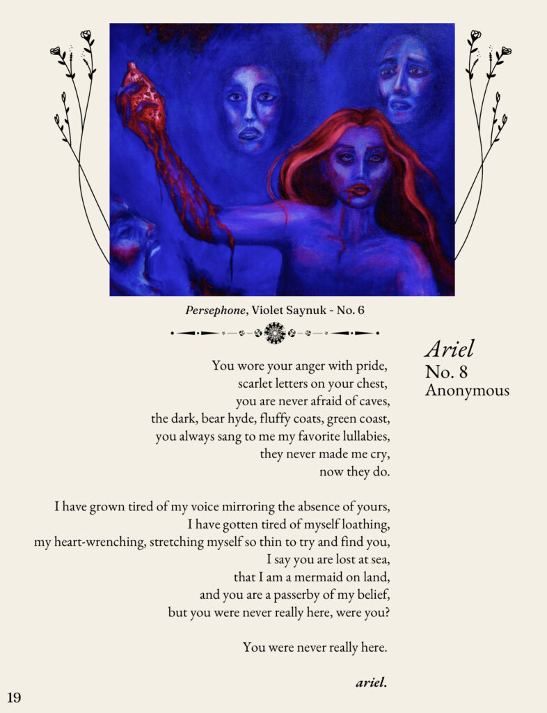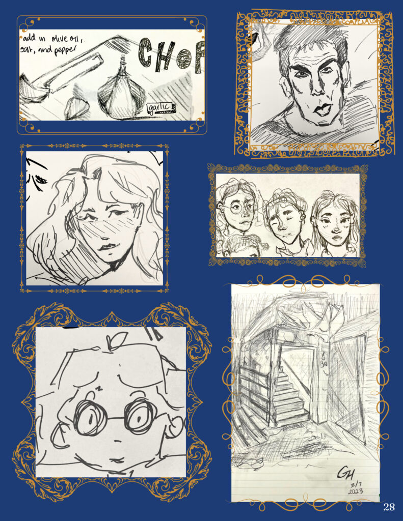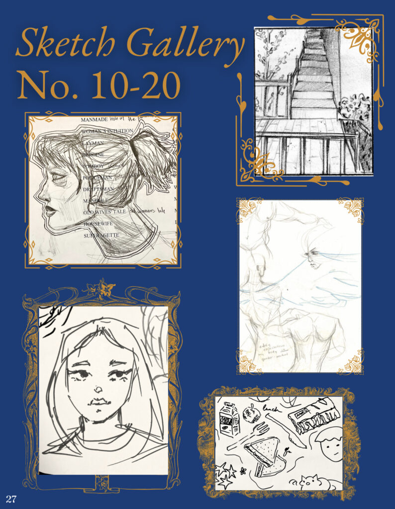 I was assistant art director for the 2022-23 edition of my school literary magazine, pictured below. I helped set the look for the publication, designed some layouts, created ornamental illustration, and contributed art and writing works to the project. For the 2023-24 edition, I am the senior art director and am currently working with the other members of the editorial board to set themes and goals for this year’s book.