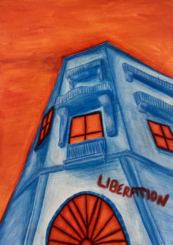 Acrylic and wall paint on plywood. To create more of an experience for the audience, I added a Cabaret themed entrance, all freehand. 2023.