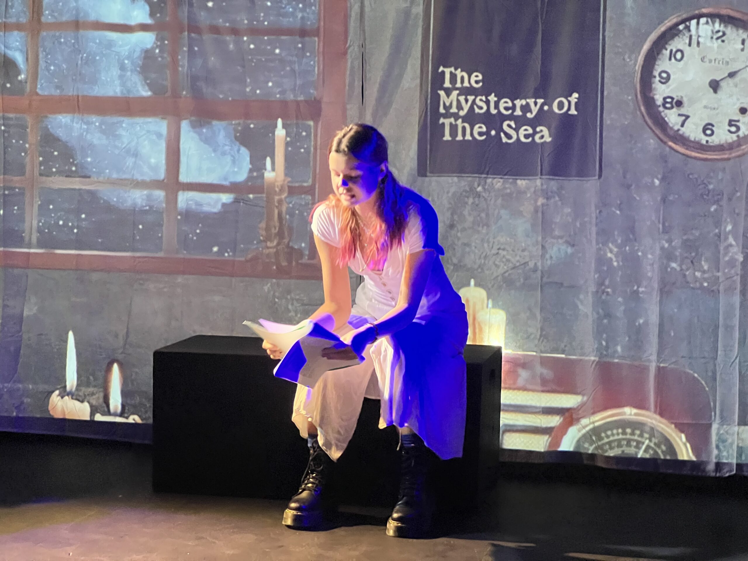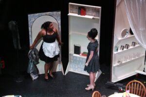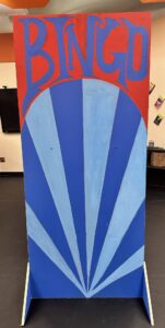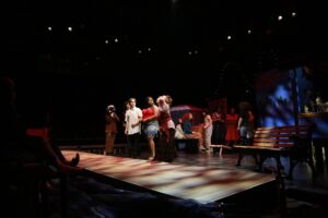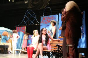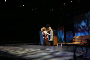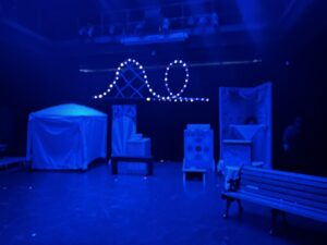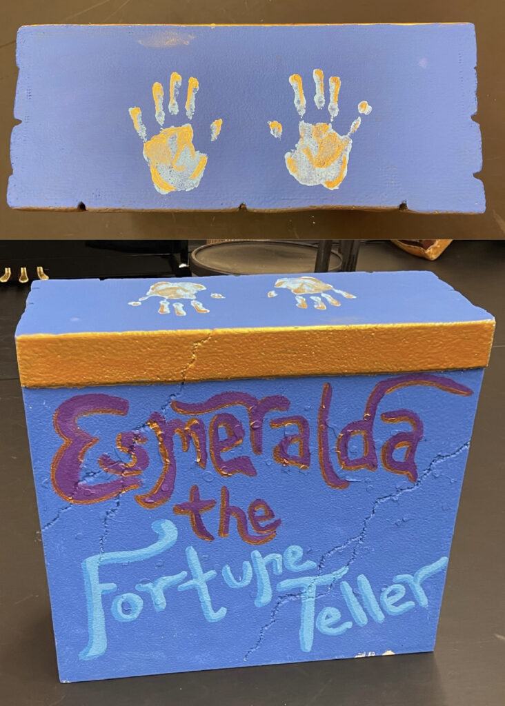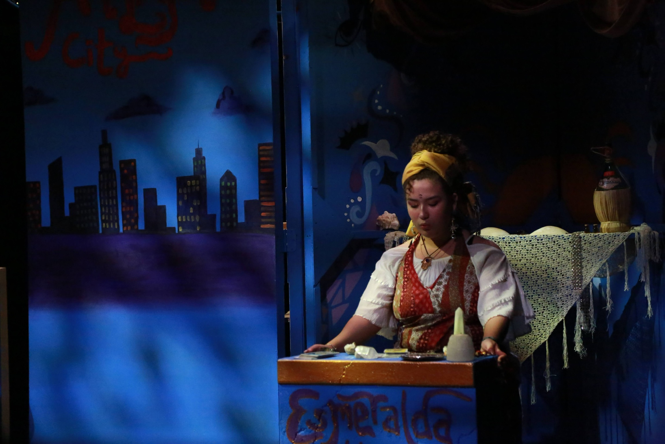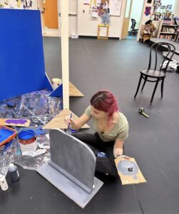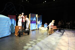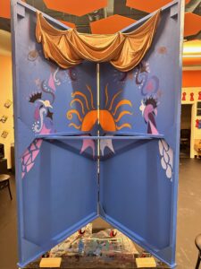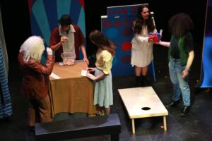 This was my very first time working as the set designer for a play, and at this point I barely had any experience. All I knew is that I loved sets that amaze the audience, so I was inspired to go big. A lit-up roller coaster suspended from the rafters, an “ocean” of blue fabric, 30 yards, all sewn, that flooded the stage… I can still hear the gasps as “water” emerged from under the audience’s feet. A bookcase with a falling shelf, an elaborately painted fortune teller’s podium.