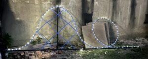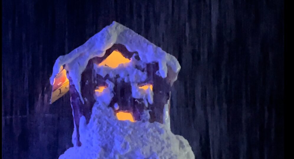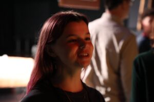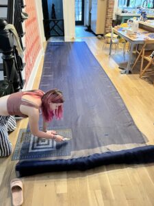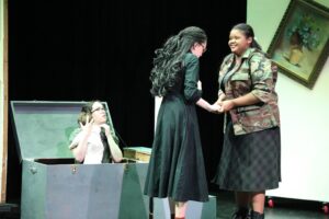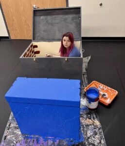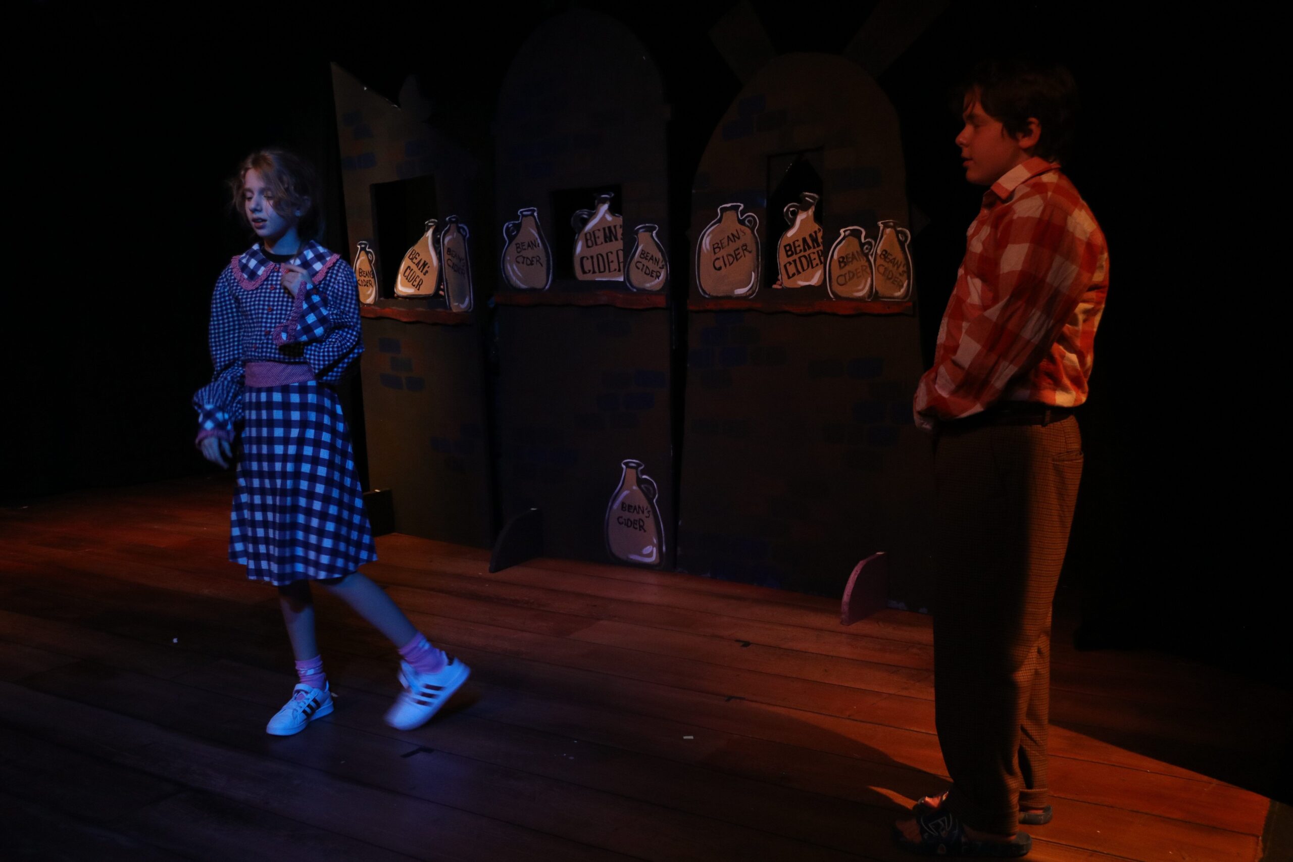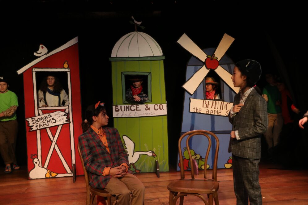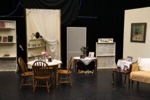 This was my very first time working as the set designer for a play, and at this point I barely had any experience. All I knew is that I loved sets that amaze the audience, so I was inspired to go big. A lit-up roller coaster suspended from the rafters, an “ocean” of blue fabric, 30 yards, all sewn, that flooded the stage… I can still hear the gasps as “water” emerged from under the audience’s feet. A bookcase with a falling shelf, an elaborately painted fortune teller’s podium.