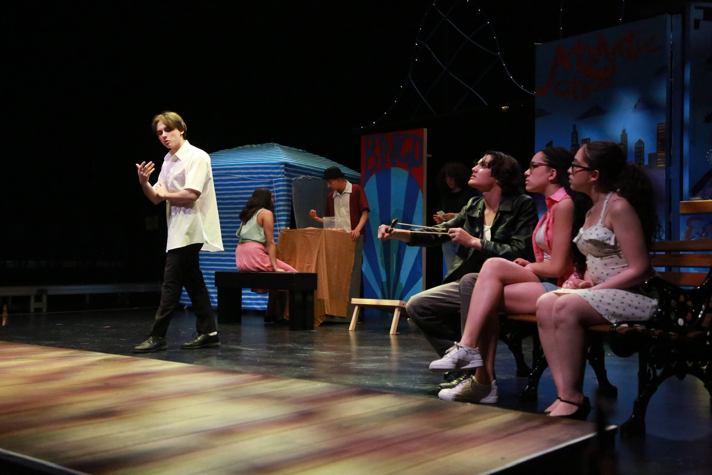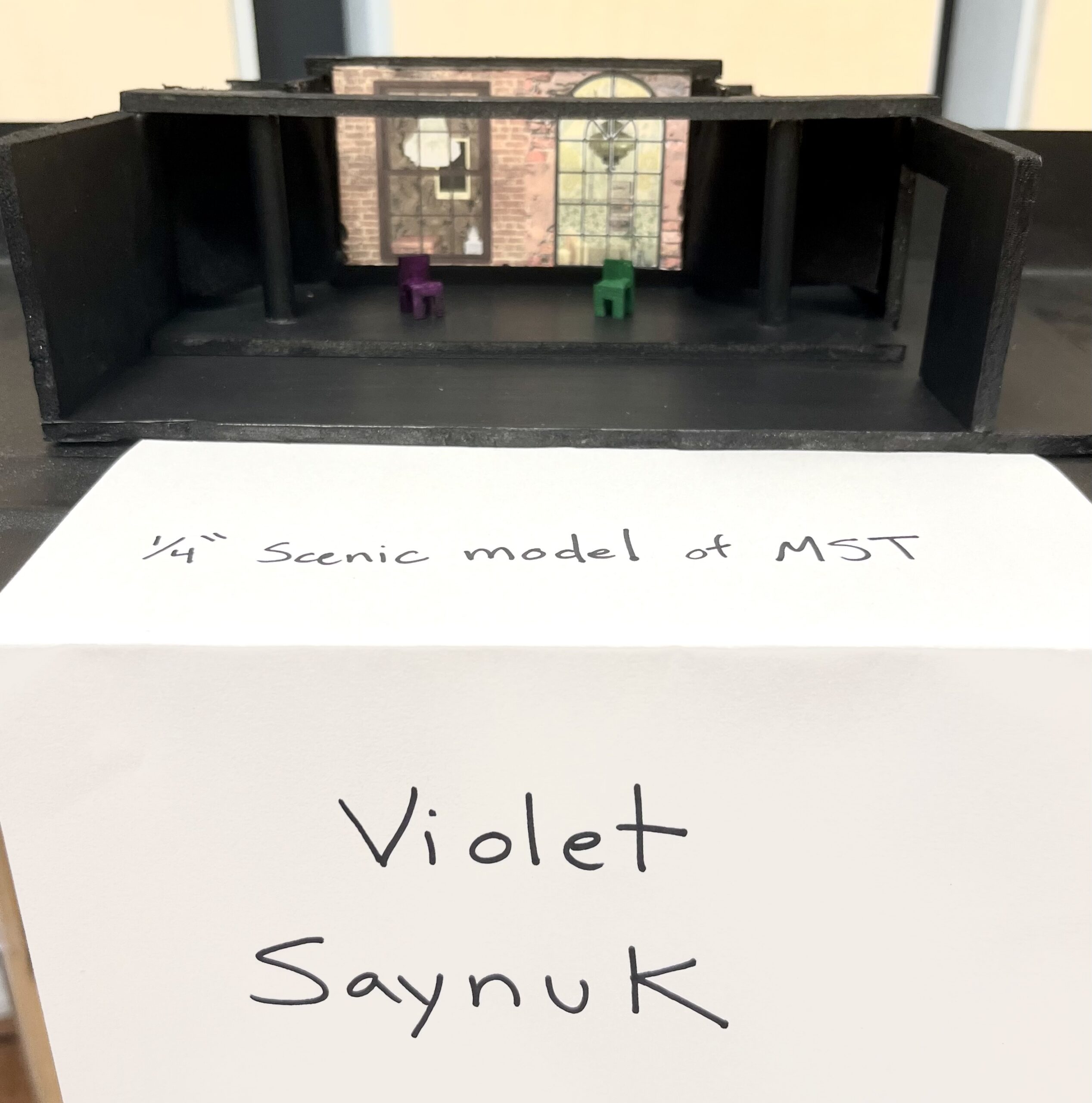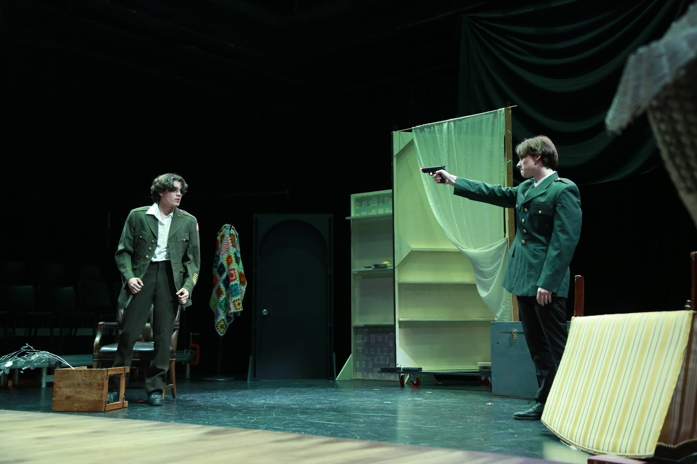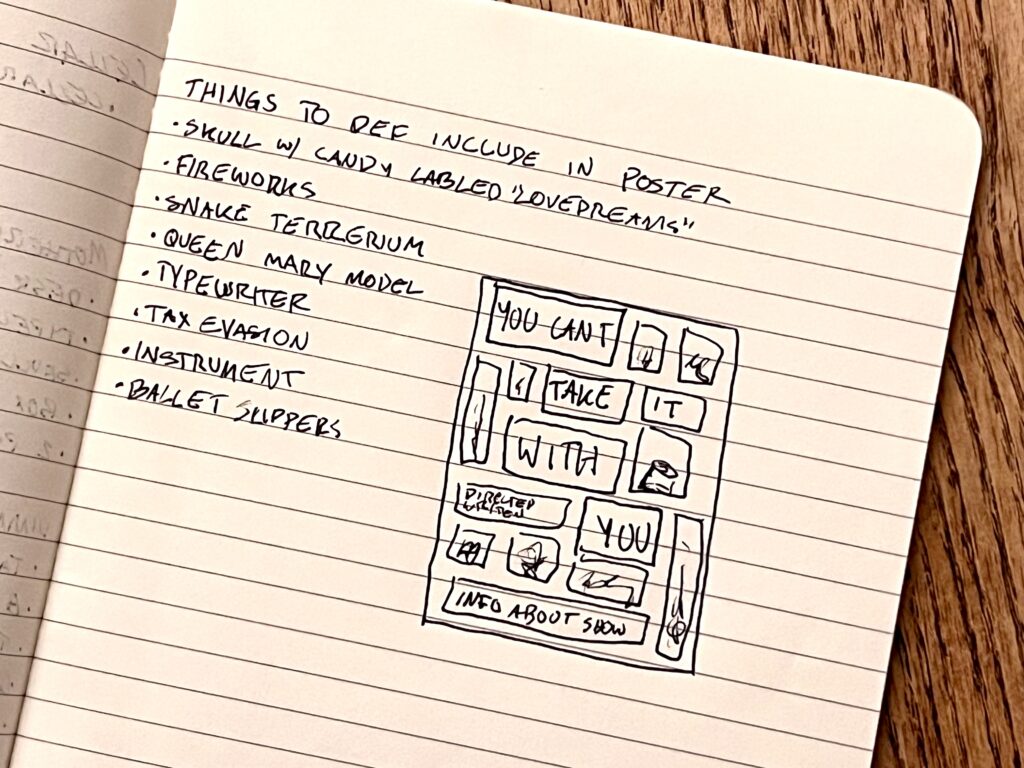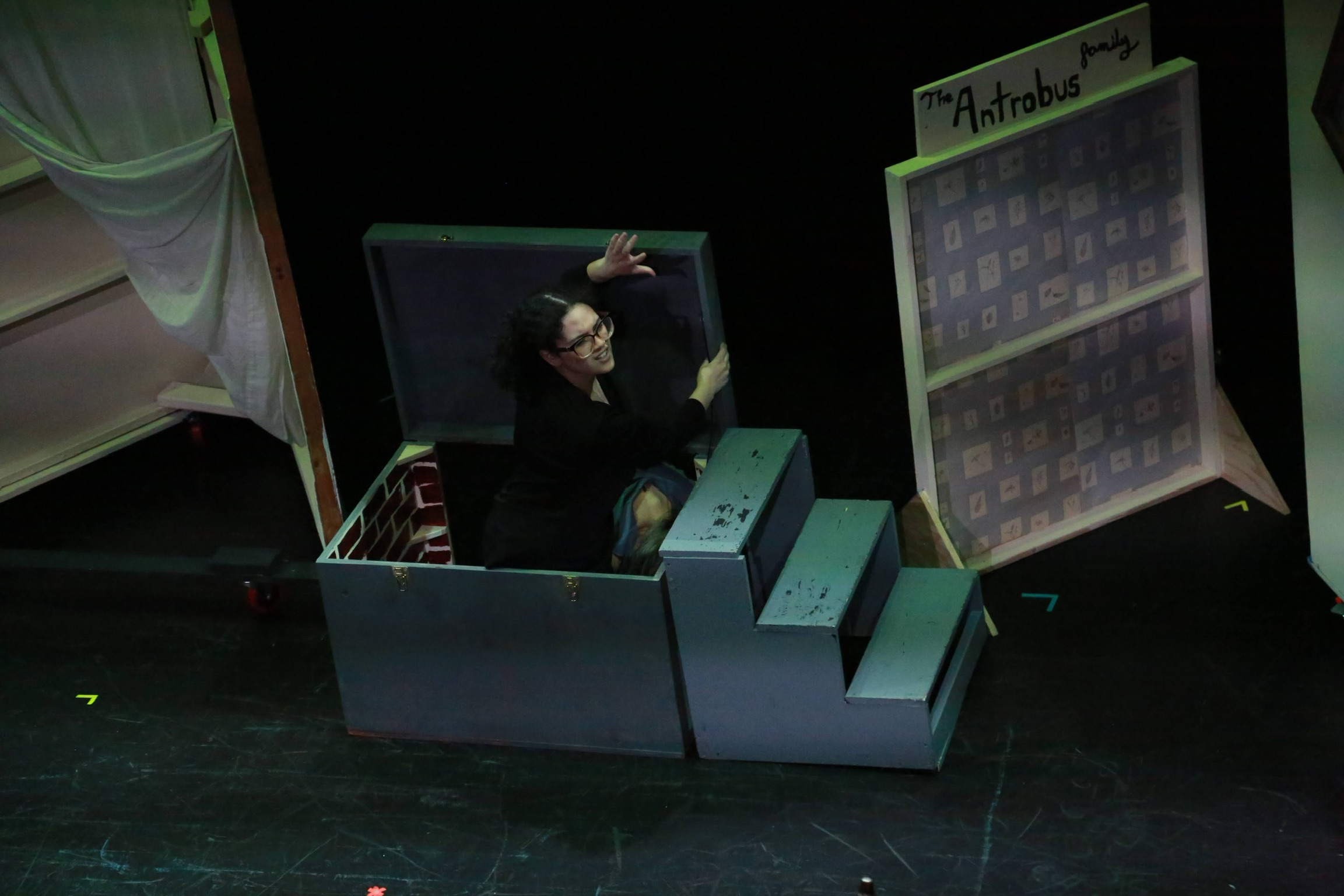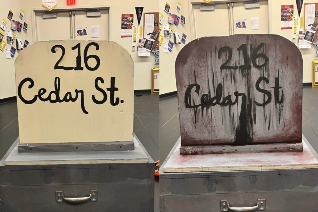 act Ithis is after the shelf i rigged dropped, causing all the books to falli did recaps of the play for the people shooting video for our YouTube channel (unprompted)act IIthe water starts moving toward the actors out from under the audiences feetact IIIthis box acted as a fireplace, a bingo counter and a cellarthis set in the third act was a disheveled version of the set in the first actthis was my original concept for the family home in the playphotoshoot before attaching the clamps to the audience bleachers in the theaterall painting was freehand and the fabric was draped and stapled onthis lettering was done freehandthe yellow side is pre-war, the grey side post-war — freehand letteringthis lettering was done freehandmy first time seeing the poster I designed on the wall, obviously a photoshoot ensuedthe cutting and sewing of the water took all weekendthe fabric was so big we had to move furniture to measure itthe water ended up being 30ft by 30ft, with a grommet every 2ftthe 15ft roller coaster i made to hang from the rafters in act II This was my first time ever getting a headset! I was Eagle 4 and I took the responsibility very seriously