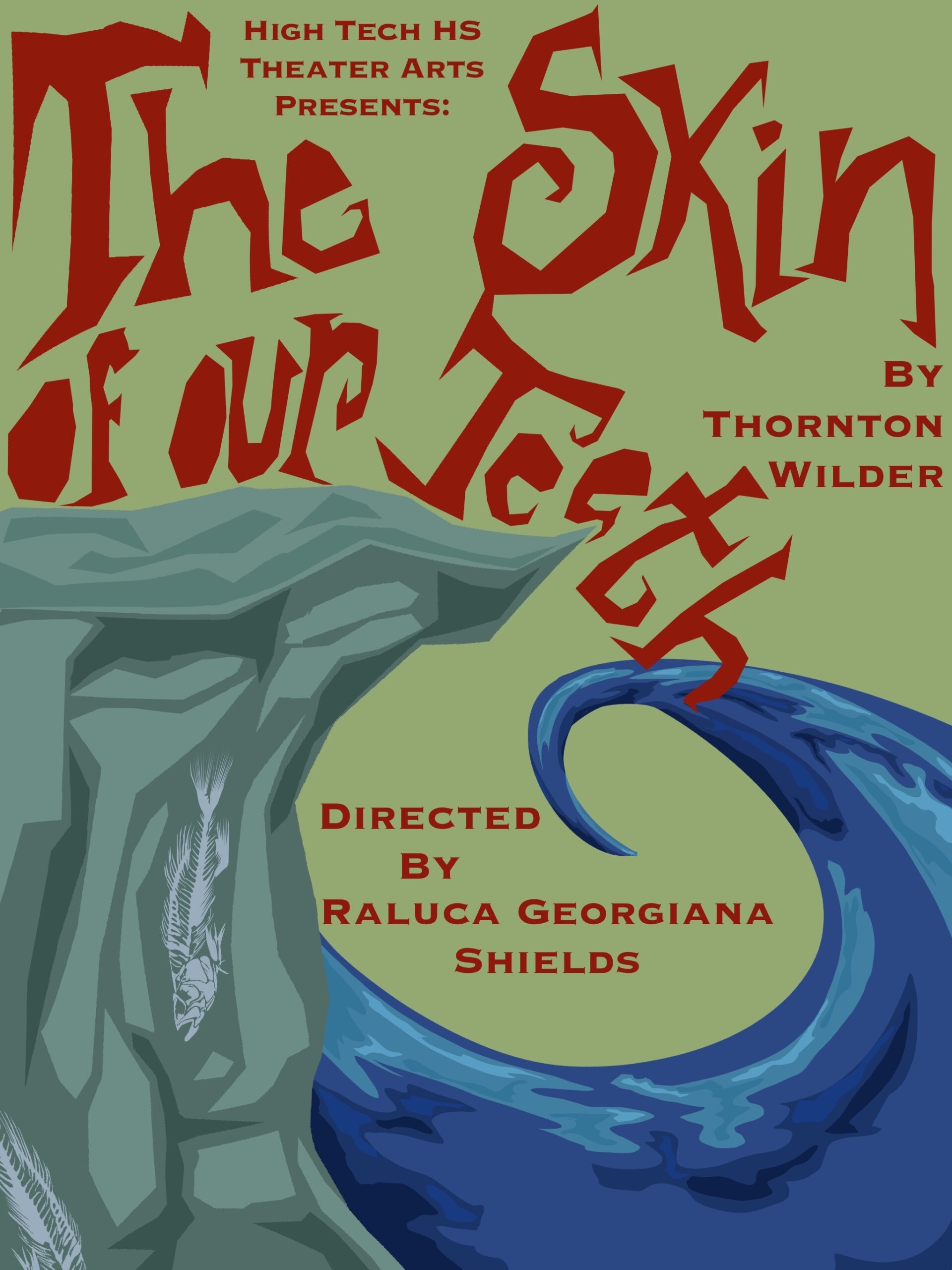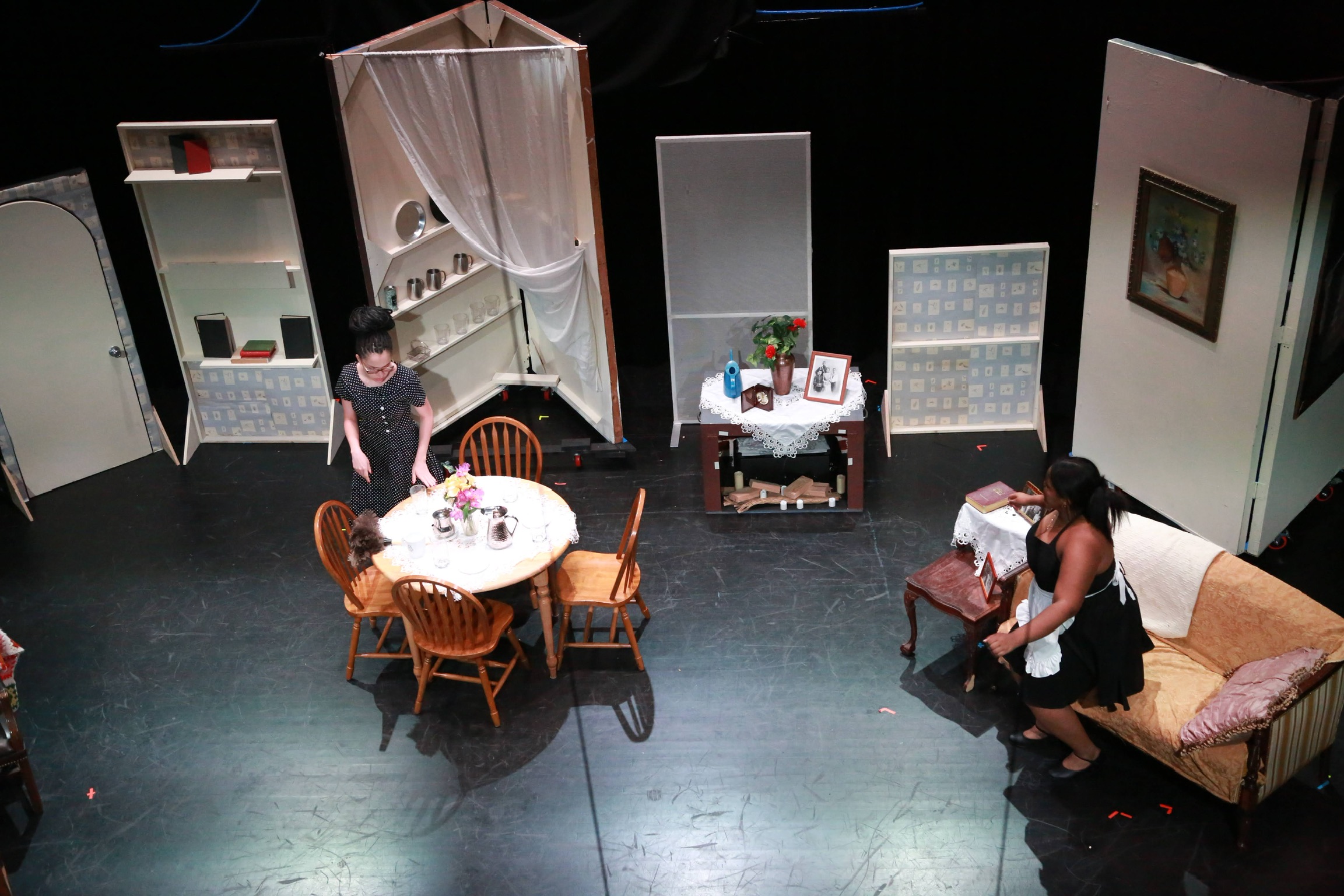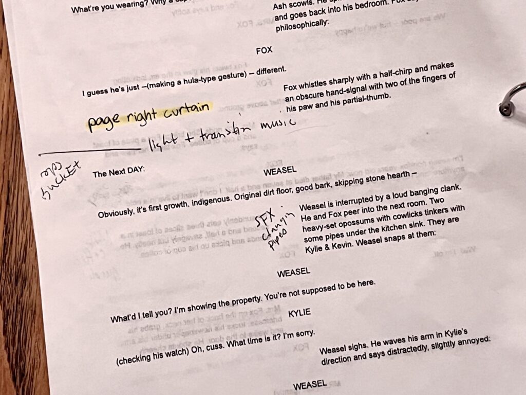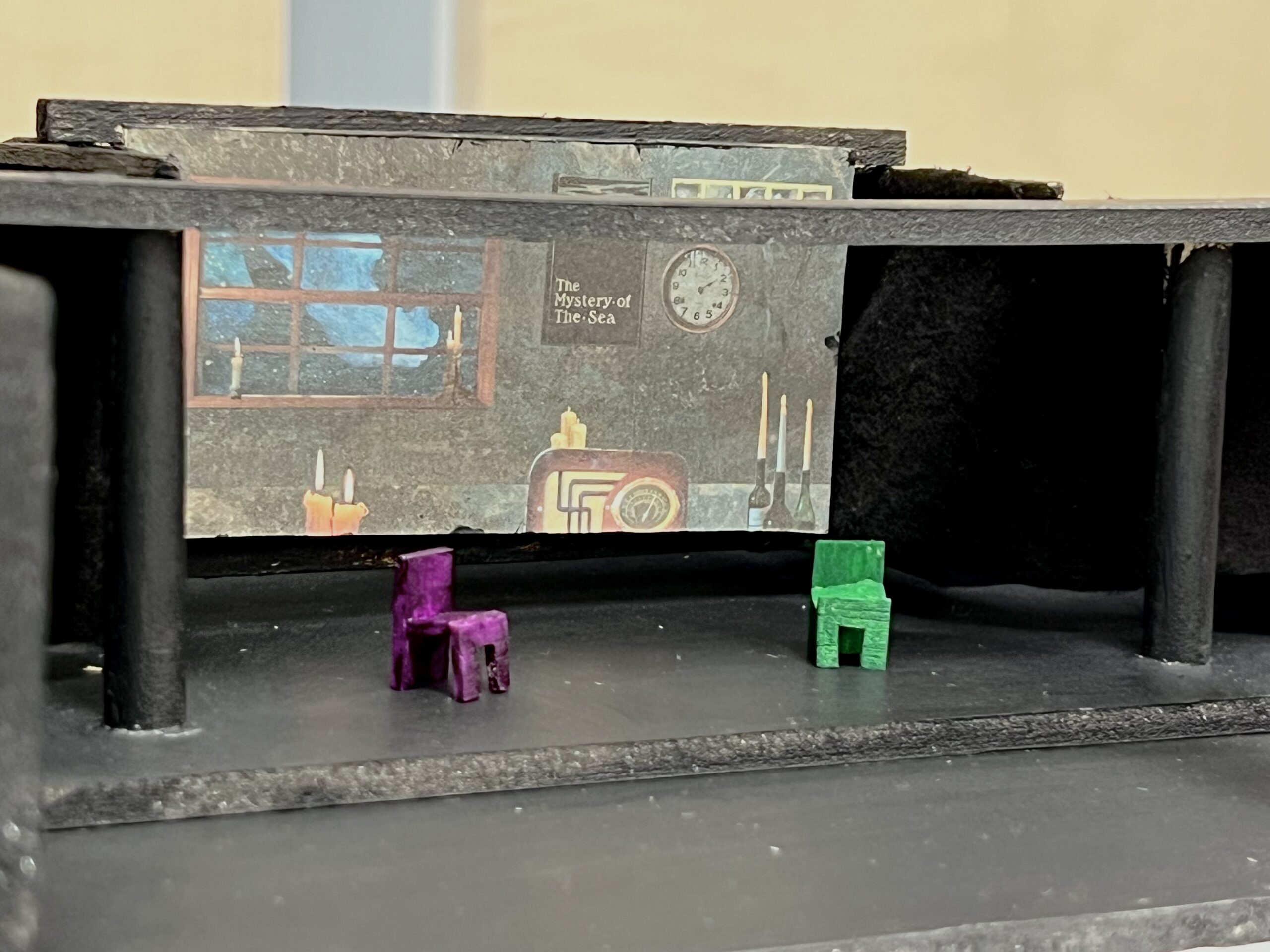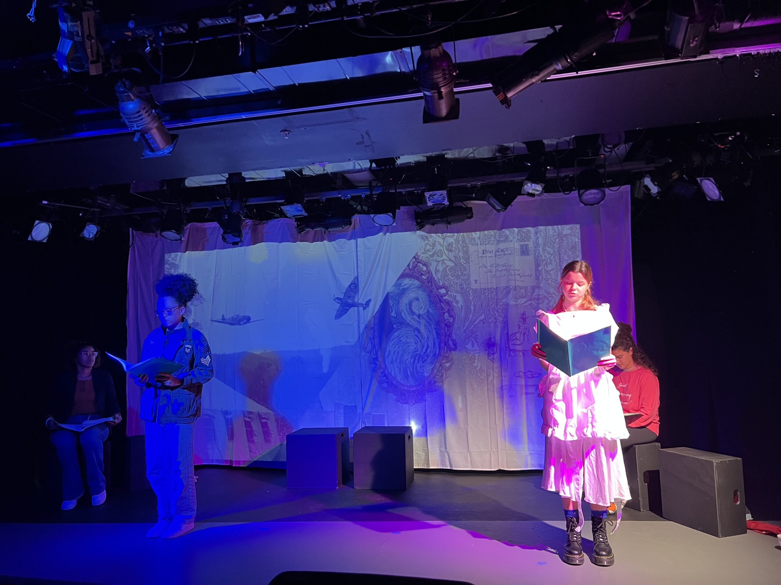 act Ithis is after the shelf i rigged dropped, causing all the books to falli did recaps of the play for the people shooting video for our YouTube channel (unprompted)act IIthe water starts moving toward the actors out from under the audiences feetact IIIthis box acted as a fireplace, a bingo counter and a cellarthis set in the third act was a disheveled version of the set in the first actthis was my original concept for the family home in the playphotoshoot before attaching the clamps to the audience bleachers in the theaterall painting was freehand and the fabric was draped and stapled onthis lettering was done freehandthe yellow side is pre-war, the grey side post-war — freehand letteringthis lettering was done freehandmy first time seeing the poster I designed on the wall, obviously a photoshoot ensuedthe cutting and sewing of the water took all weekendthe fabric was so big we had to move furniture to measure itthe water ended up being 30ft by 30ft, with a grommet every 2ftthe 15ft roller coaster i made to hang from the rafters in act II This was my first time ever getting a headset! I was Eagle 4 and I took the responsibility very seriously