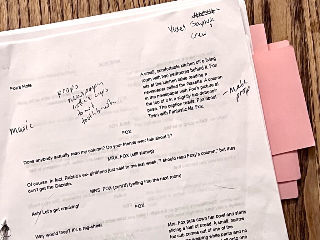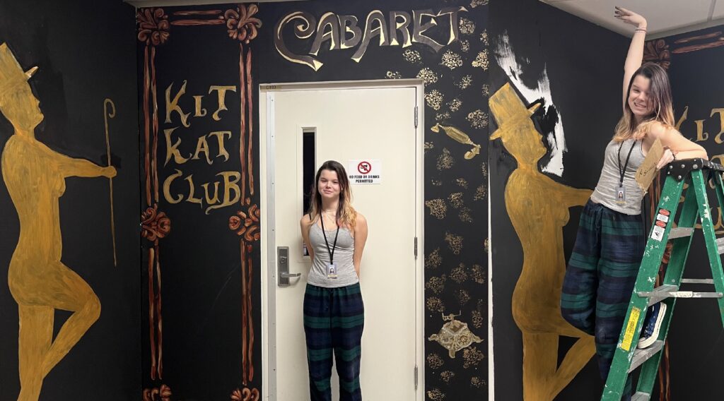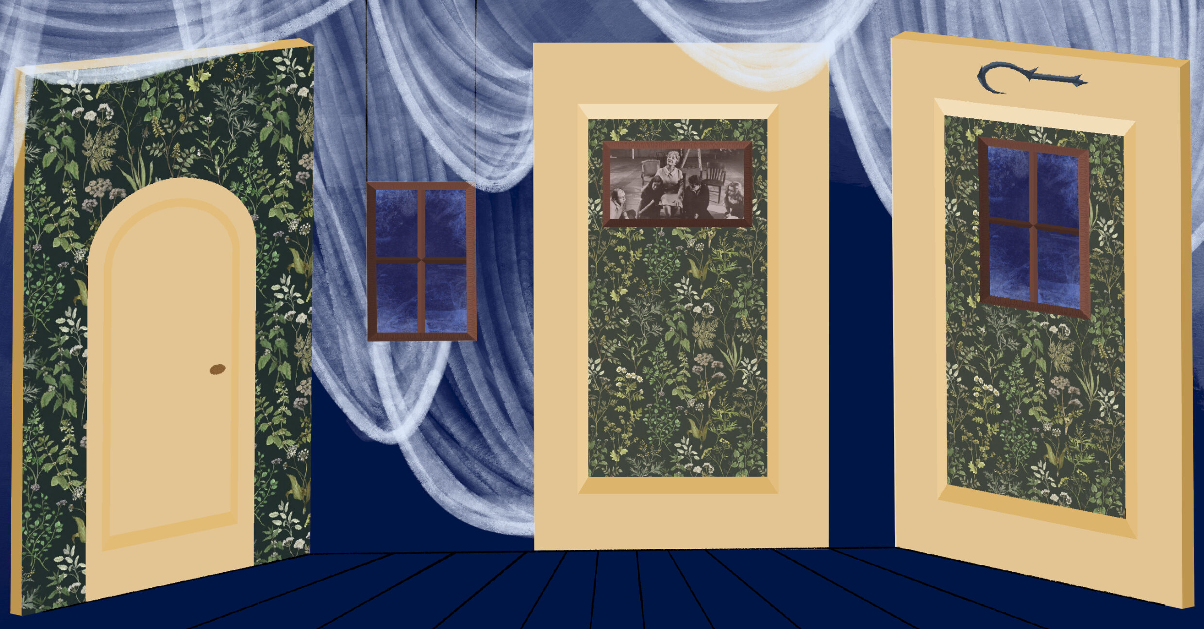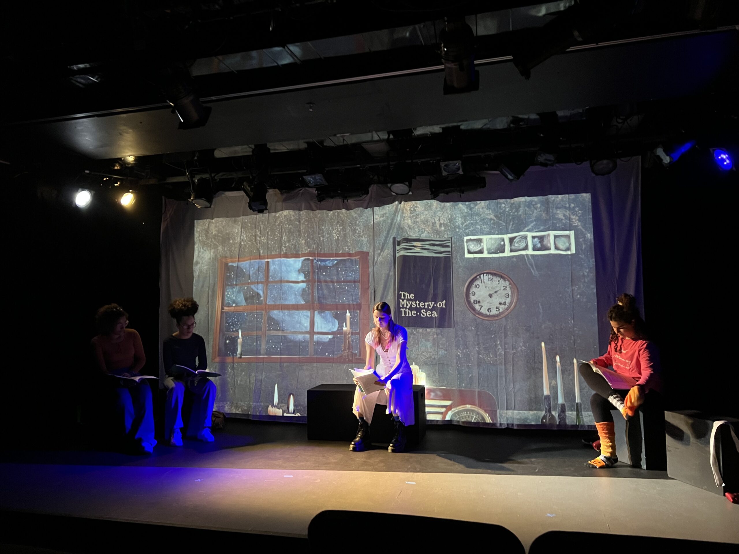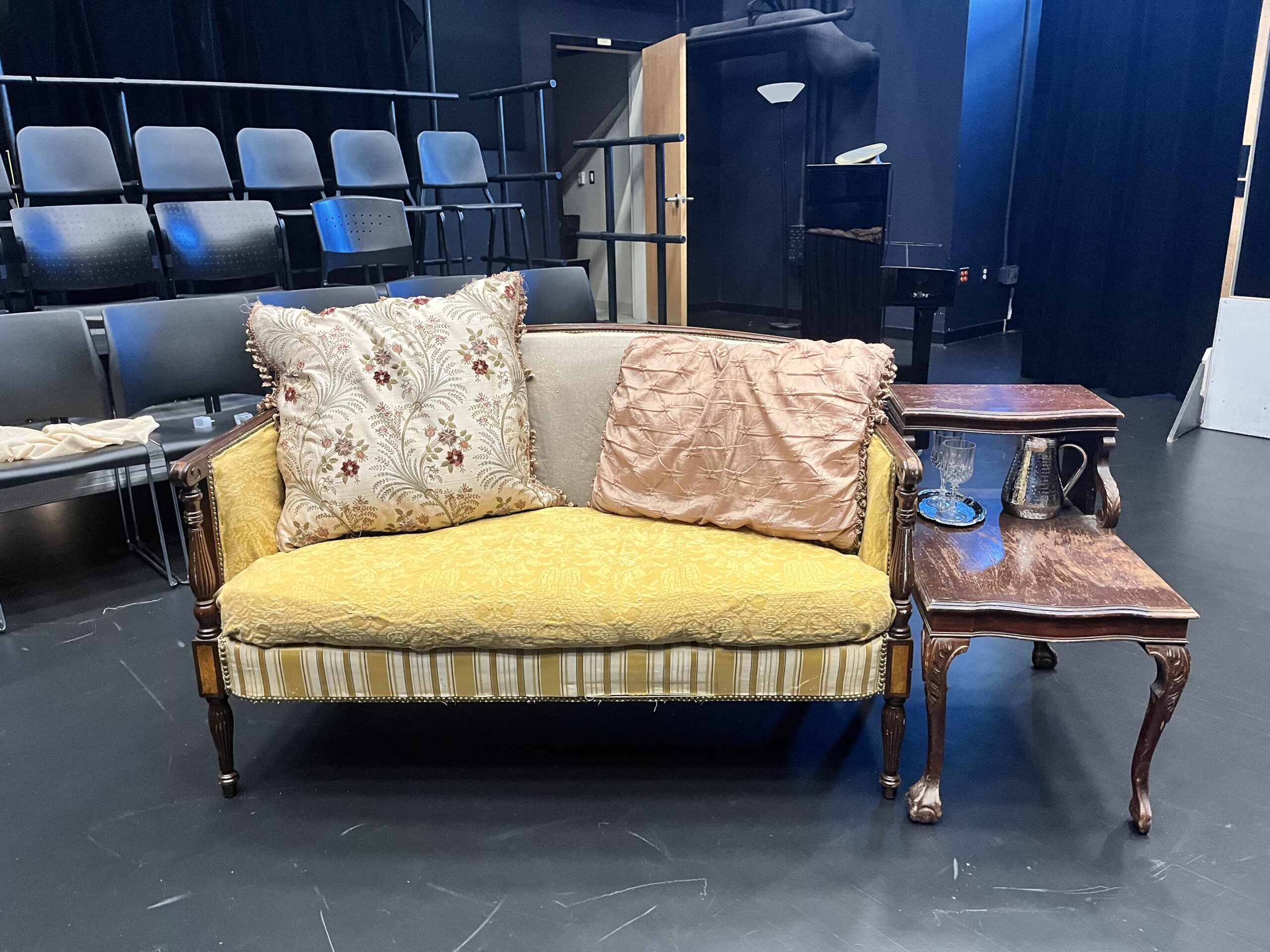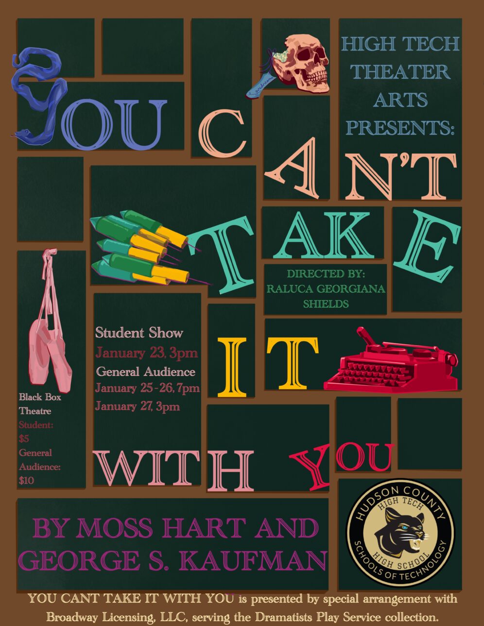 act Ithis is after the shelf i rigged dropped, causing all the books to falli did recaps of the play for the people shooting video for our YouTube channel (unprompted)act IIthe water starts moving toward the actors out from under the audiences feetact IIIthis box acted as a fireplace, a bingo counter and a cellarthis set in the third act was a disheveled version of the set in the first actthis was my original concept for the family home in the playphotoshoot before attaching the clamps to the audience bleachers in the theaterall painting was freehand and the fabric was draped and stapled onthis lettering was done freehandthe yellow side is pre-war, the grey side post-war — freehand letteringthis lettering was done freehandmy first time seeing the poster I designed on the wall, obviously a photoshoot ensuedthe cutting and sewing of the water took all weekendthe fabric was so big we had to move furniture to measure itthe water ended up being 30ft by 30ft, with a grommet every 2ftthe 15ft roller coaster i made to hang from the rafters in act II This was my first time ever getting a headset! I was Eagle 4 and I took the responsibility very seriously