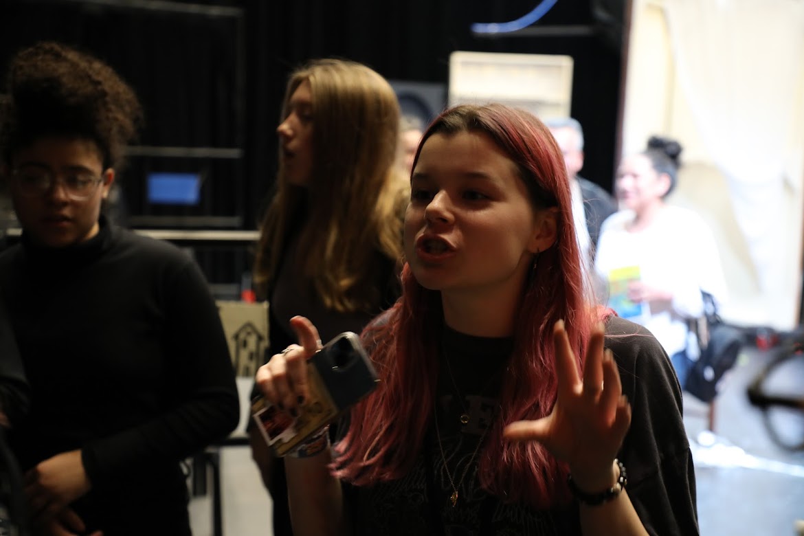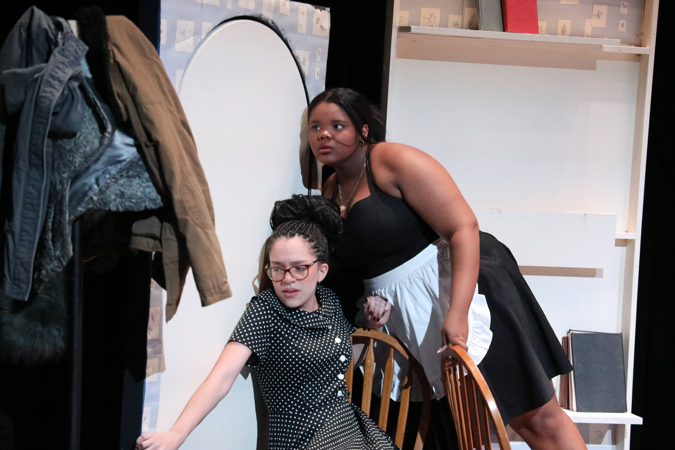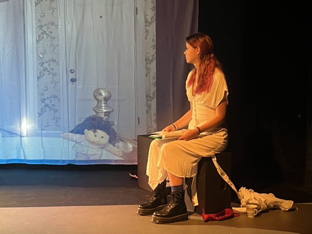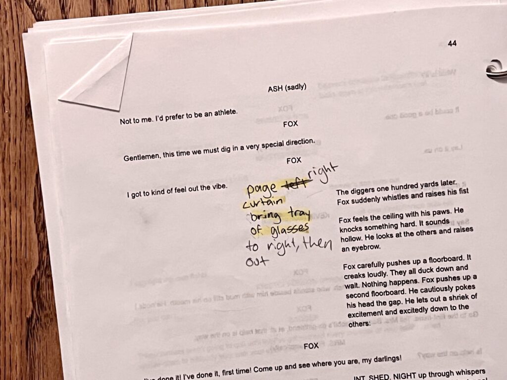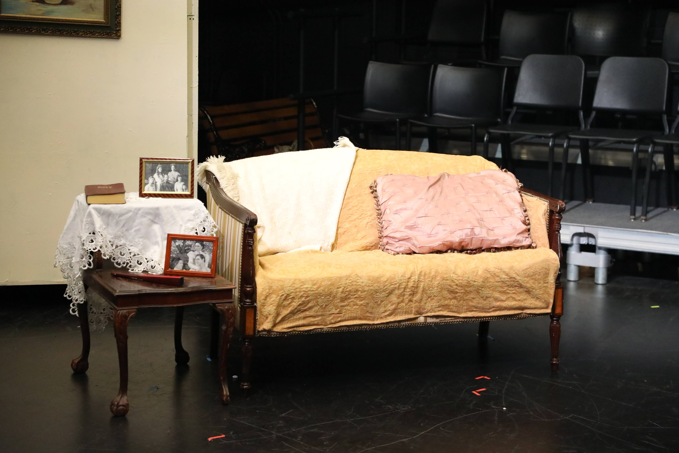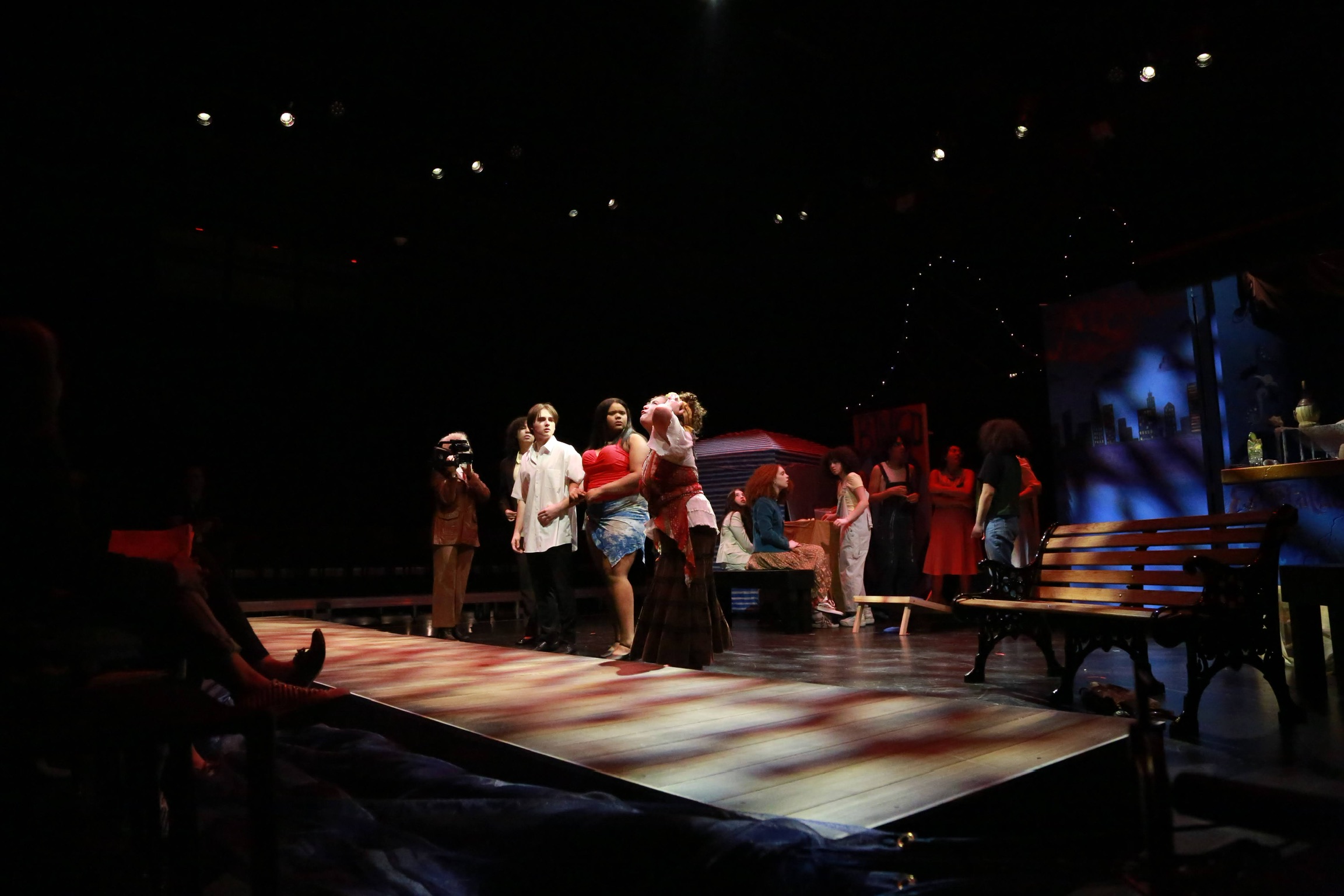 act Ithis is after the shelf i rigged dropped, causing all the books to falli did recaps of the play for the people shooting video for our YouTube channel (unprompted)act IIthe water starts moving toward the actors out from under the audiences feetact IIIthis box acted as a fireplace, a bingo counter and a cellarthis set in the third act was a disheveled version of the set in the first actthis was my original concept for the family home in the playphotoshoot before attaching the clamps to the audience bleachers in the theaterall painting was freehand and the fabric was draped and stapled onthis lettering was done freehandthe yellow side is pre-war, the grey side post-war — freehand letteringthis lettering was done freehandmy first time seeing the poster I designed on the wall, obviously a photoshoot ensuedthe cutting and sewing of the water took all weekendthe fabric was so big we had to move furniture to measure itthe water ended up being 30ft by 30ft, with a grommet every 2ftthe 15ft roller coaster i made to hang from the rafters in act II This was my first time ever getting a headset! I was Eagle 4 and I took the responsibility very seriously