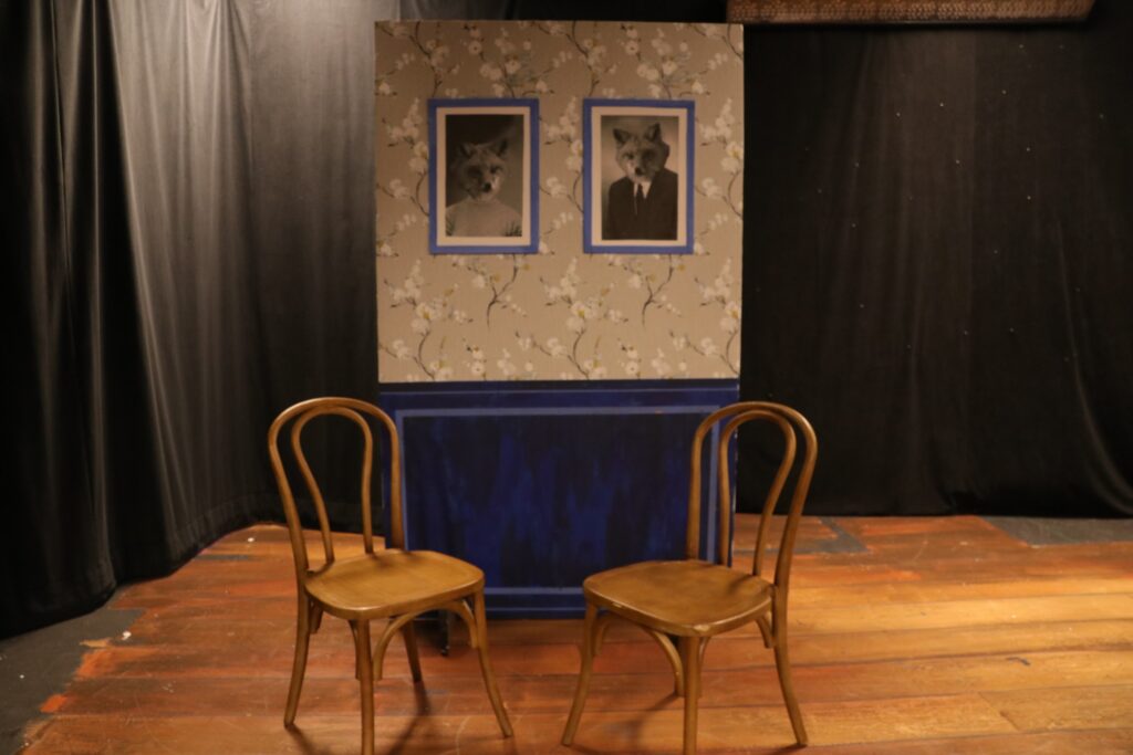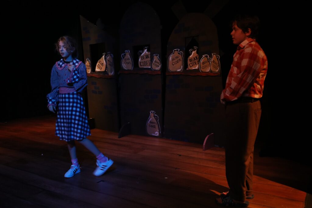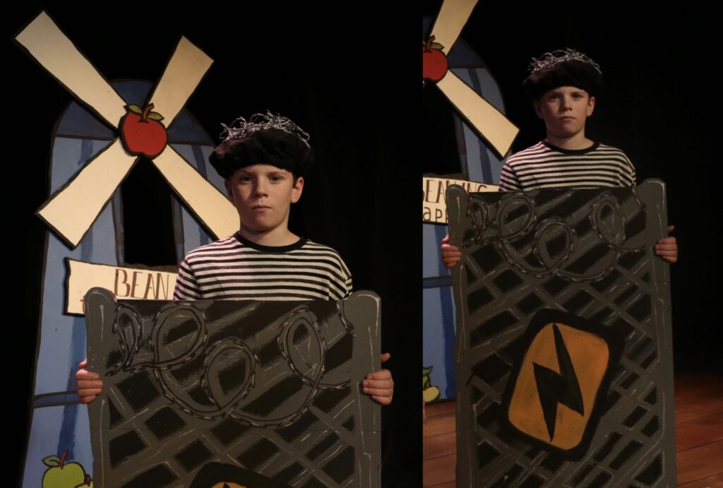 i wanted Captain Spavento’s costume to be as over the top as possible, as his character is a dramatic captain whose scared of bloodi came up with the concept of having one side of the stage be the exterior of the in and the other be the interior