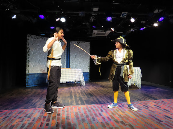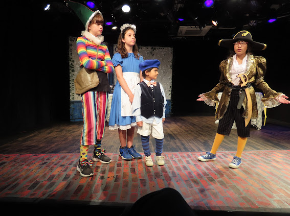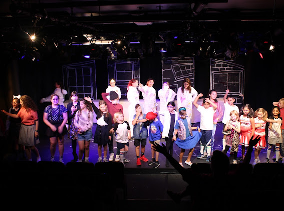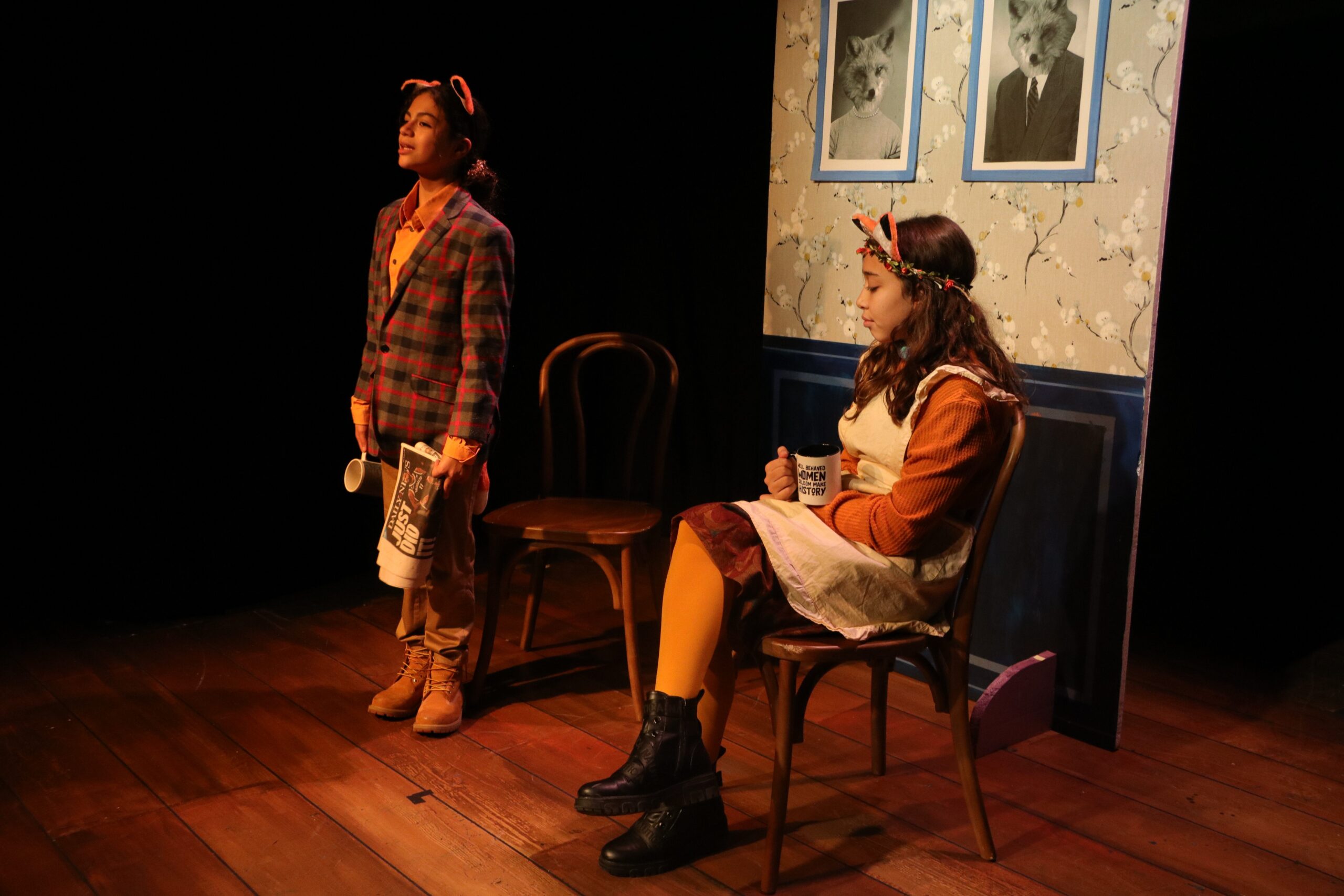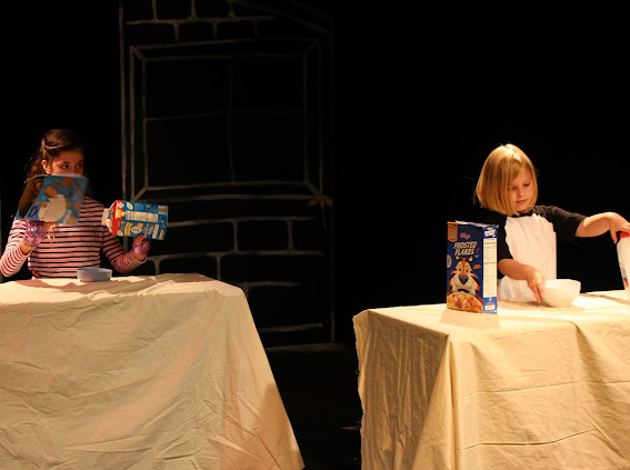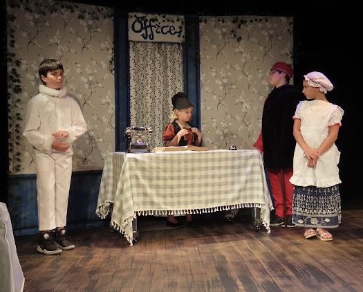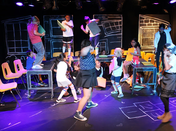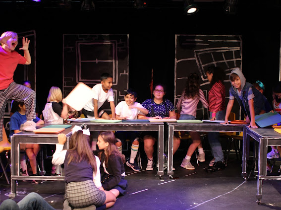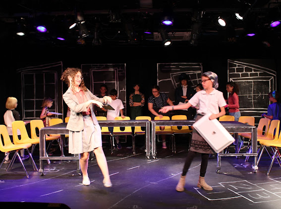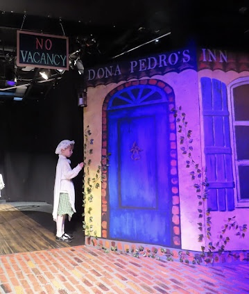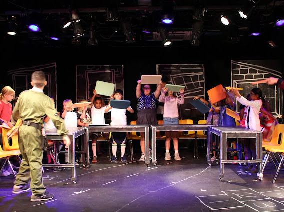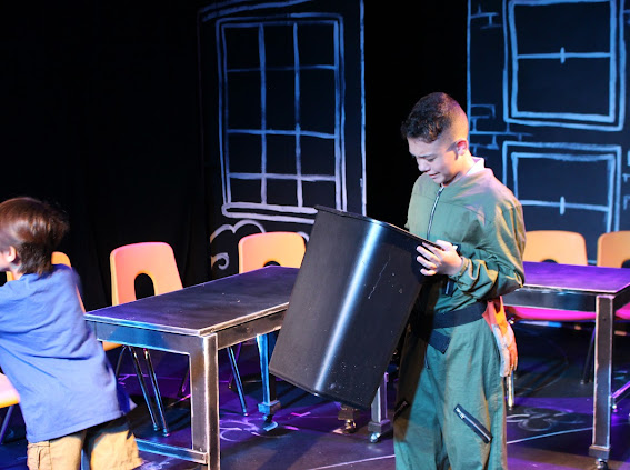 The second play I helped produce this summer was another original, but this one was set to music with no dialogue. The playful chalkboard look represented the homes and classrooms of the childhood setting. I helped build and paint the set, and designed the costumes of the parents (2 hippie parents, 2 sleepy moms, 2 sporty parents, 1 single dad, 2 supportive dads, 2 military parents and 1 single mom) while taking into account that I had a 5 minute scene with all parents rotating in and out and only 5 actors to play them all!